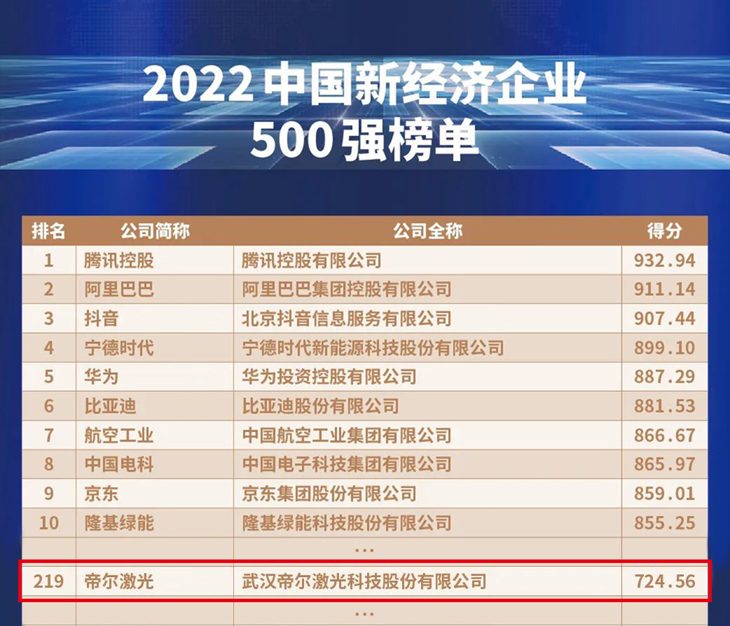 近日,以“加快建設世界一流企業”為主題的2022中國新經濟企業500強發布會在北京舉行。在中國企業評價協會發布的“2022中國新經濟企業500強”榜單中,帝爾激光位列第219位,相較去年的第389位,排名提升了170位。