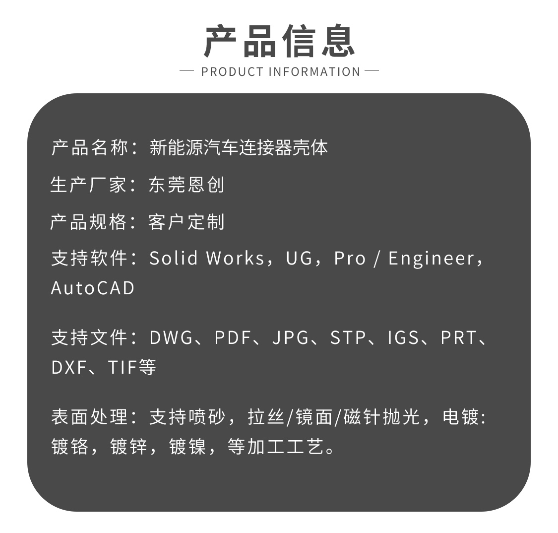 東莞恩創(chuàng)精密,鋅合金壓鑄廠家,20臺(tái)300噸鋅合金壓鑄機(jī)臺(tái),服務(wù)于全球多家知名廠商,連接器外殼,新能源連接器外殼壓鑄件,公差可達(dá)正負(fù)0.002.鹽霧測(cè)試最高可達(dá)720小時(shí),貫穿孔精度全部使用CCD全檢.