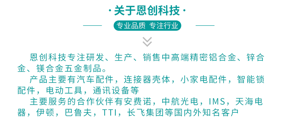 恩創精密五金專業從事鋅合金壓鑄件的生產加工廠,加工產品:連接器外殼,新能源連接器殼體,小家電殼體壓鑄廠,恩創擁有20臺50-300噸壓鑄機,自主開模,所有產品全部目視全檢出貨.