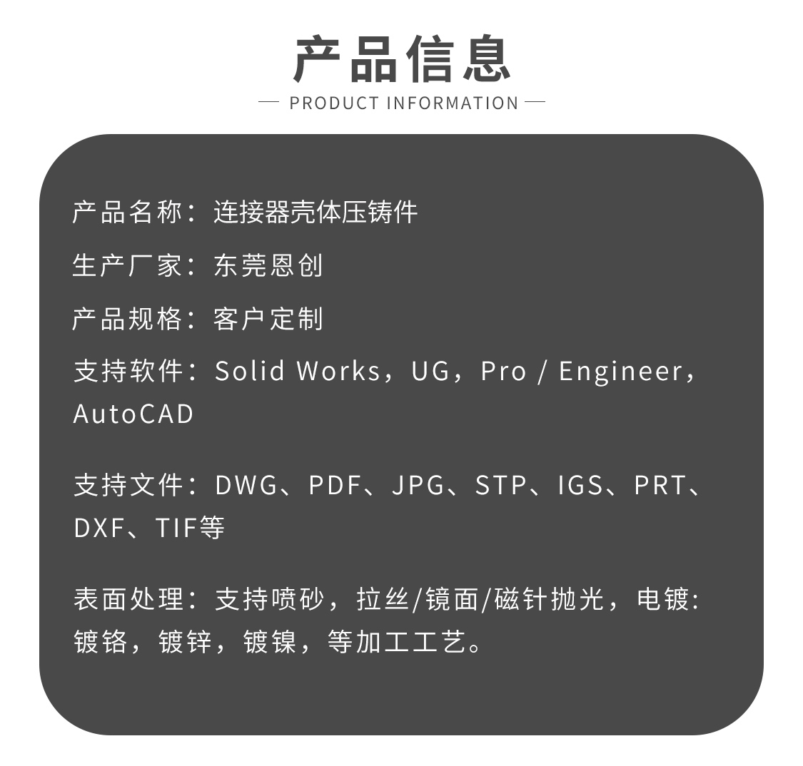 恩創(chuàng)精密壓鑄鋅合金連接器殼體,連接器外殼壓鑄件,已為多個(gè)連接器廠商提供連接器殼體生產(chǎn),精密壓鑄,公差可達(dá)正負(fù)0.002.表面處理鹽霧要求最高可達(dá)720小時(shí),連接器殼體貫穿孔CCD全檢。